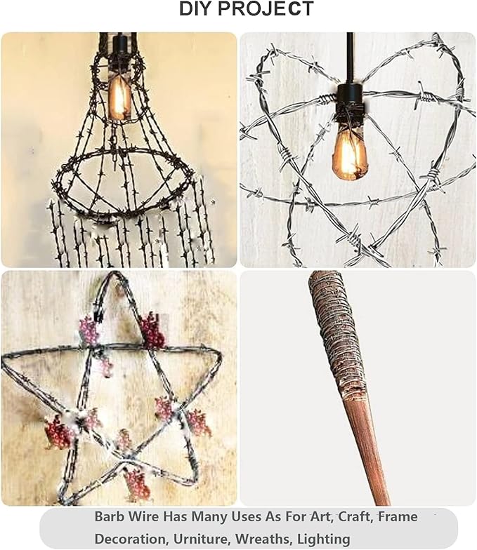Barbed Wire Fence, 4 Point Barbed wire, 18Gauge Barbed Wire Roll for Crafts, Fences, and Critter Deterrent with a Pair of GlovesOur barbwire is double twisted and is made of thick hot dip galvanized steel wire, It is not easy to rust, it is very stable and durable.Thanks to the two twisted running wires, The barb wire roll is particularly tensile and break-resistant, so it offers perfect safety protection.The installation and removal of the barbed wire fence is very convenient, and it is very durable and has a long service life after installation.The delivery of the barbed wire roll include a pair of gloves to prevent the sharp point from scratching your hands.